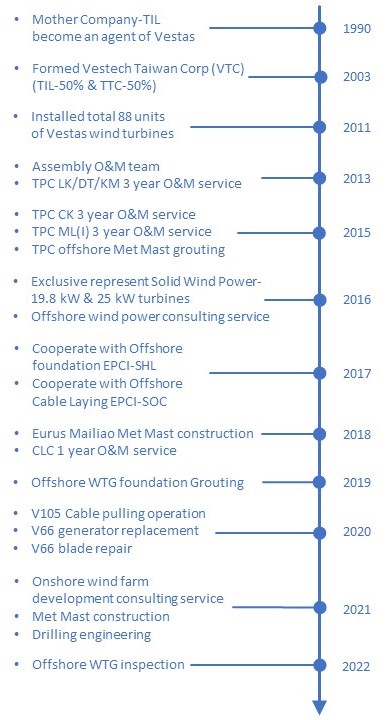 One of the mother company, Total Industrial Ltd. (TIL), first contacted and signed representative contract with the largest wind turbine manufacturer, Vestas Wind System A/S in 1990. In the year of 200, TIL and Toyota Tsusho Corporation (TTC) together formed Vestech Taiwan Corporation (VTC) to serve as exclusive representative of Vestas Wind System A/S from Denmark. In response to the trend of global green energy and environmental protection and being optimistic about the market potential and development of wind power energy in Taiwan mainland, VTC actively participated in all wind power construction projects of Taiwan Power Company (TPC) and introduced the latest technology and related knowledge from Europe into Taiwan.